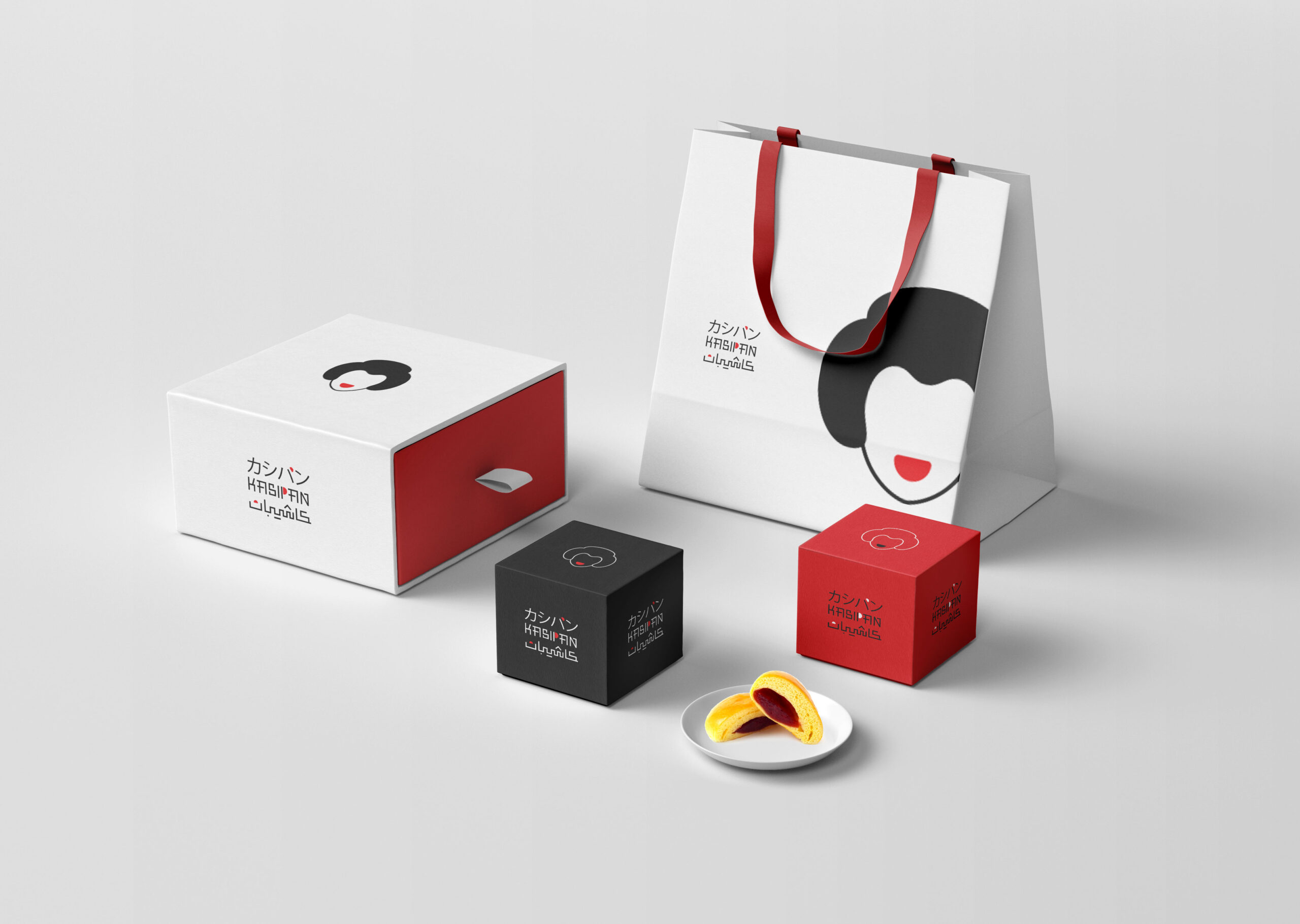 The design solution incorporated a fluffy cake shape as a central motif, symbolizing the bakery’s unique offerings. Traditional kimono patterns inspired the visual aesthetics, enhancing the cultural connection. A trilingual logotype in Arabic, English, and Japanese was developed using typography reminiscent of Japanese characters. The color palette of white, red, and black emphasized Japanese heritage while ensuring visual contrast and modernity.